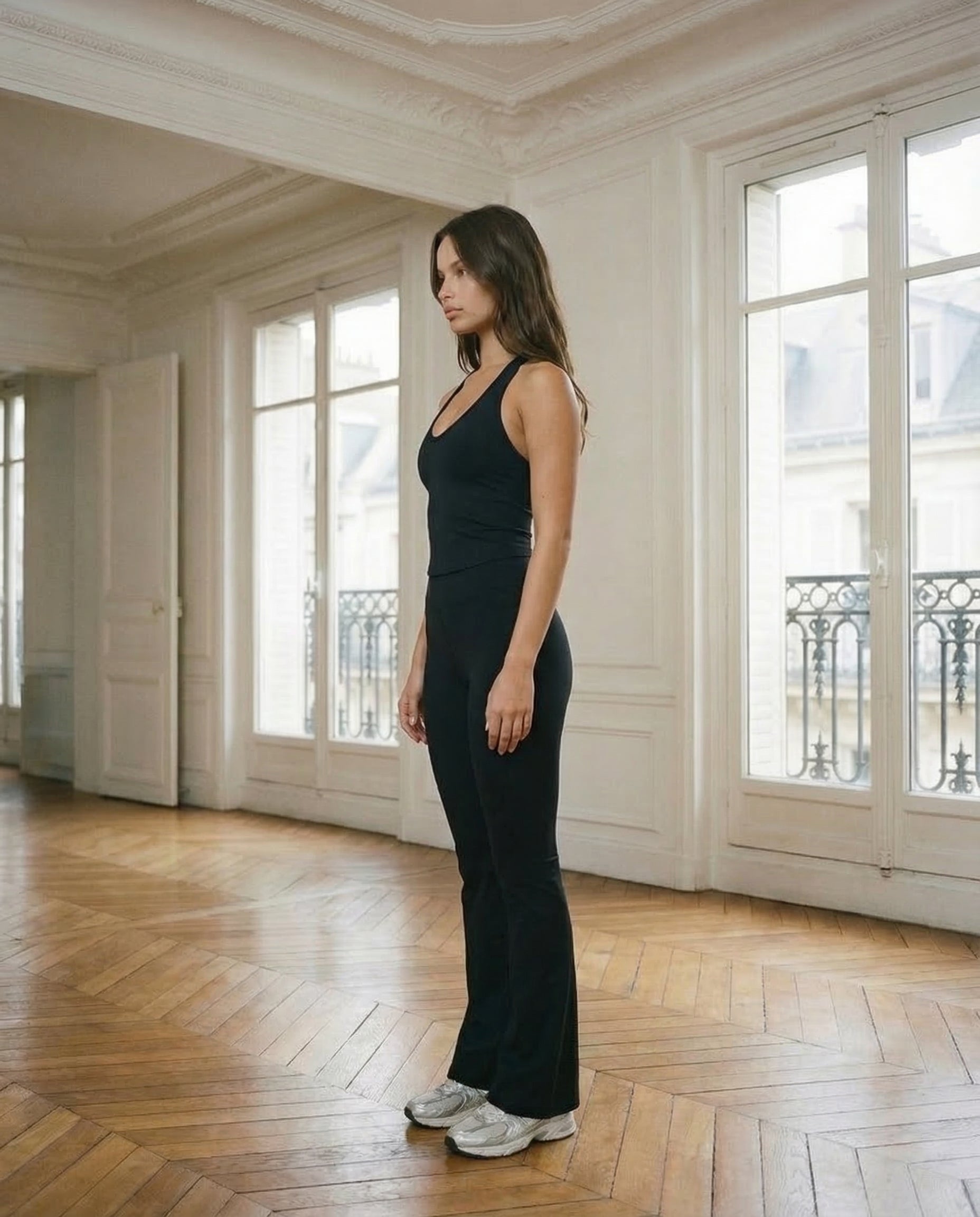 Elle est exactement entre les deux — pas trop compressive, pas trop légère. Je la mets pour le yoga flow et elle suit tous mes mouvements sans jamais bouger. La matière est vraiment agréable contre la peau.